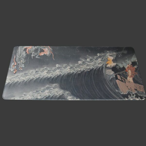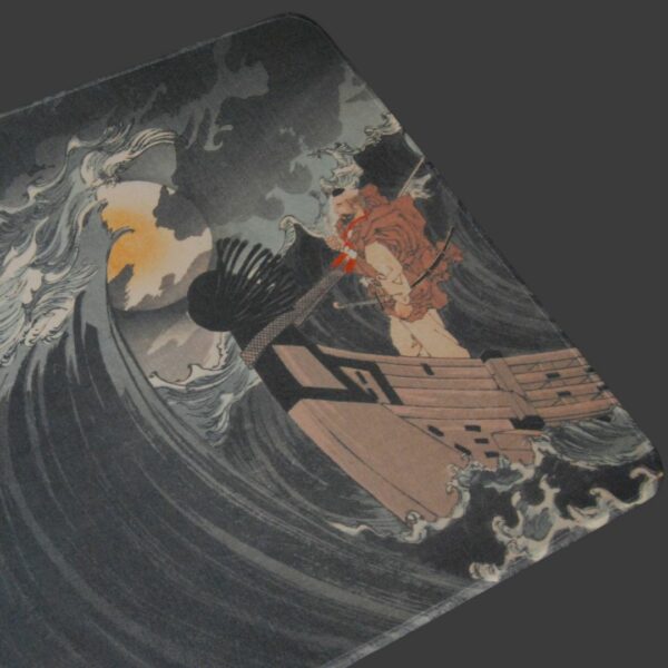 Holding his prayer beads in his hands, he knows for certain that the dragon, god of water, will protect his life and the boat of Yoshitsune during his travels on the resentful sea.